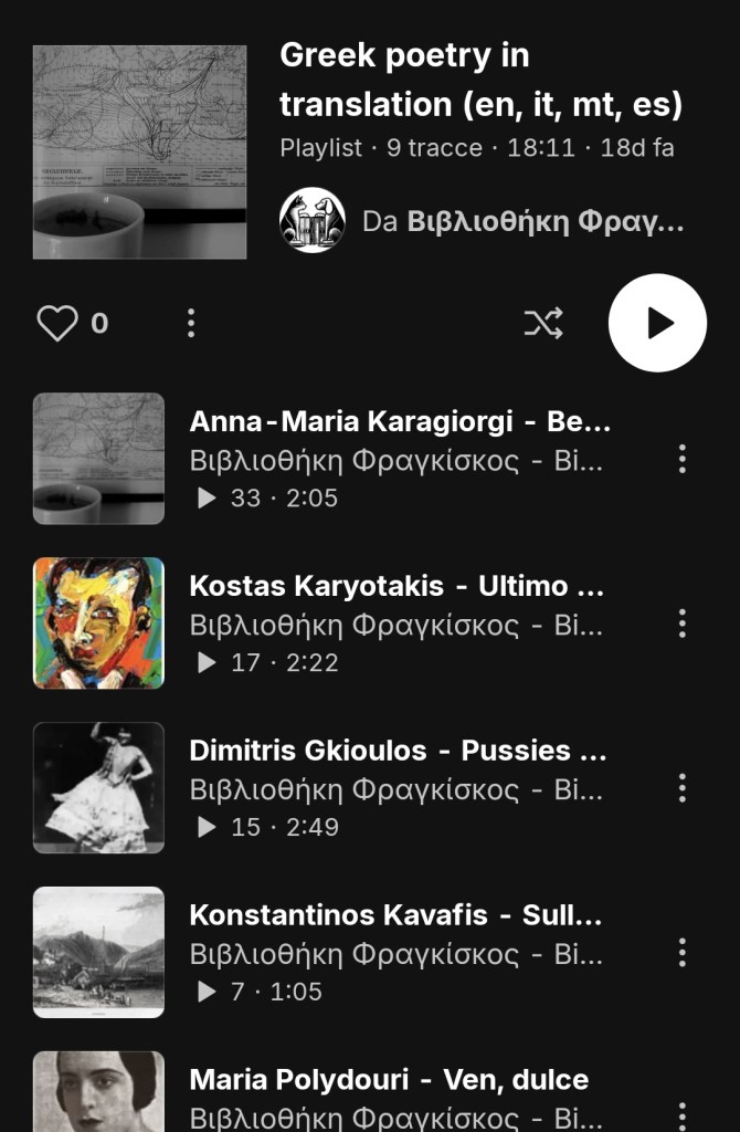 In September 2024, together with poet and actor friends in Argentina, France, Greece, Italy, Macedonia, Malta, Panama and Spain, we recorded over a hundred poems and prose extracts in different languages. The recordings will slowly be uploaded on the Bibliothíki Frangískos soundcloud page, and made searchable here by language and subject.